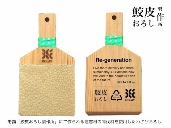 道志村「養老の森」での森林整備の間伐材(ヒノキ)を使用し、岐阜の老舗「鮫皮おろし製作所」にて作られた本物鮫皮使用のミニおろし。 持ち手部分に滑り止め細引きロープ巻き仕様。1名(サイズ/ 横5cmx縦9cm厚み1.2cm 鮫皮部分横5cmx縦4.5cm)