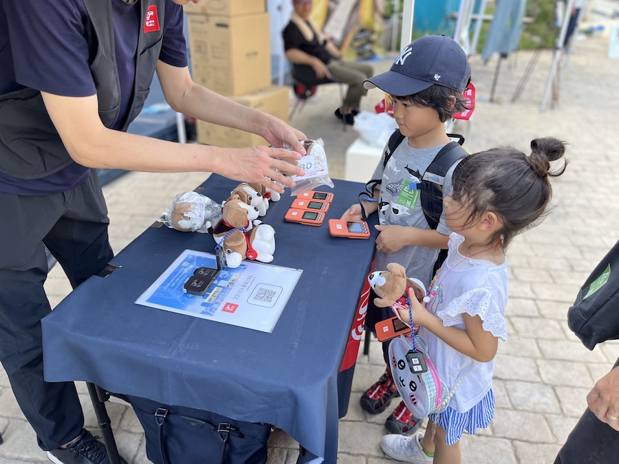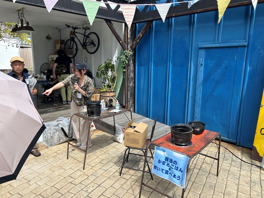 新聞紙で炊ける「魔法のかまどごはん」をみんなで体験、炊けたごはんをみんなで試食しました。味付けしたりキッチンカーでカレールーをかけてキャンプメシ体験をしました。また品川区とも連携して賞味期限の近づいた備蓄米など配布もいたしました。