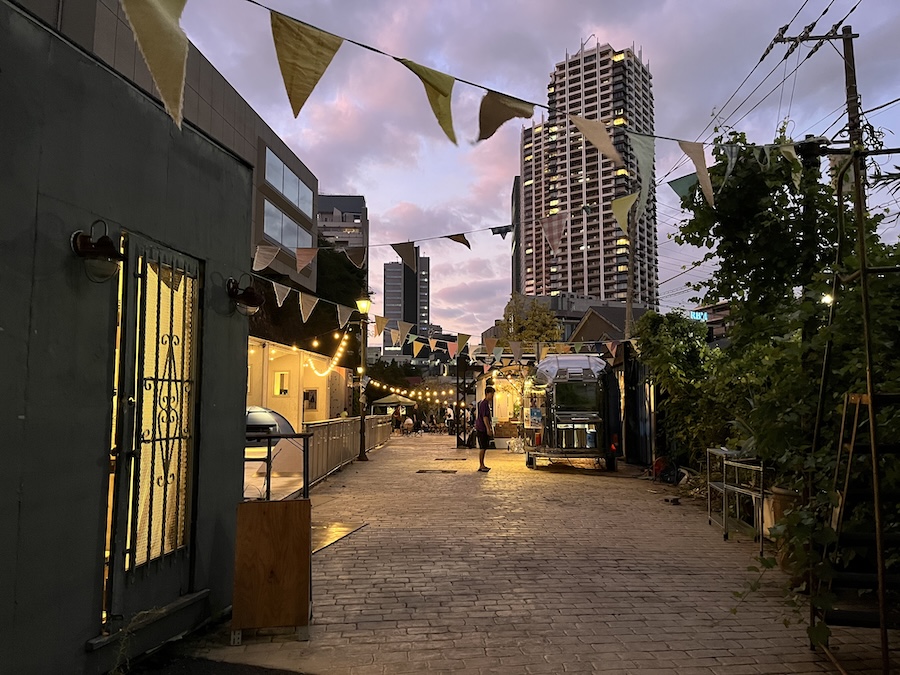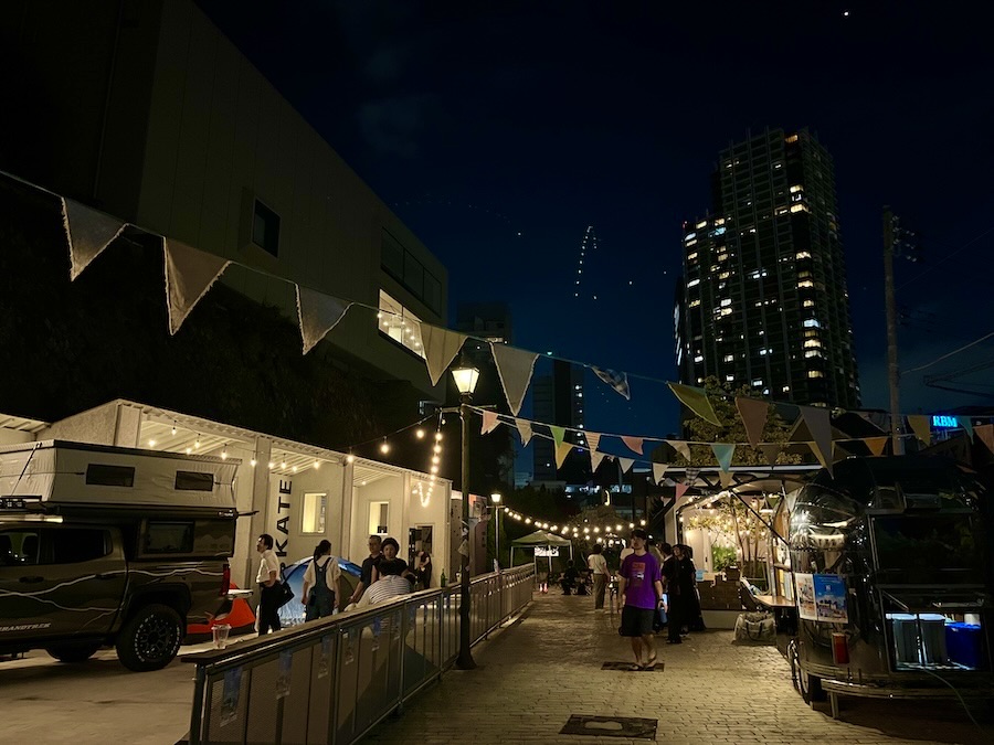 日も短くなりました。左側の普段はスケートパークがキャンプ会場に、協力いただいたブランドのテントやflexdreamのカスタムキャンピングカーで野外泊体験をしました。