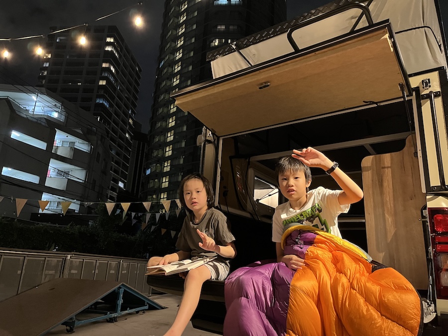 キャンプが初めての方がご参加いただきテント、寝袋、マットをお貸出しして一夜を明かしました。初めてのキャンピングカーにワクワクしながら夜が更けていきます。