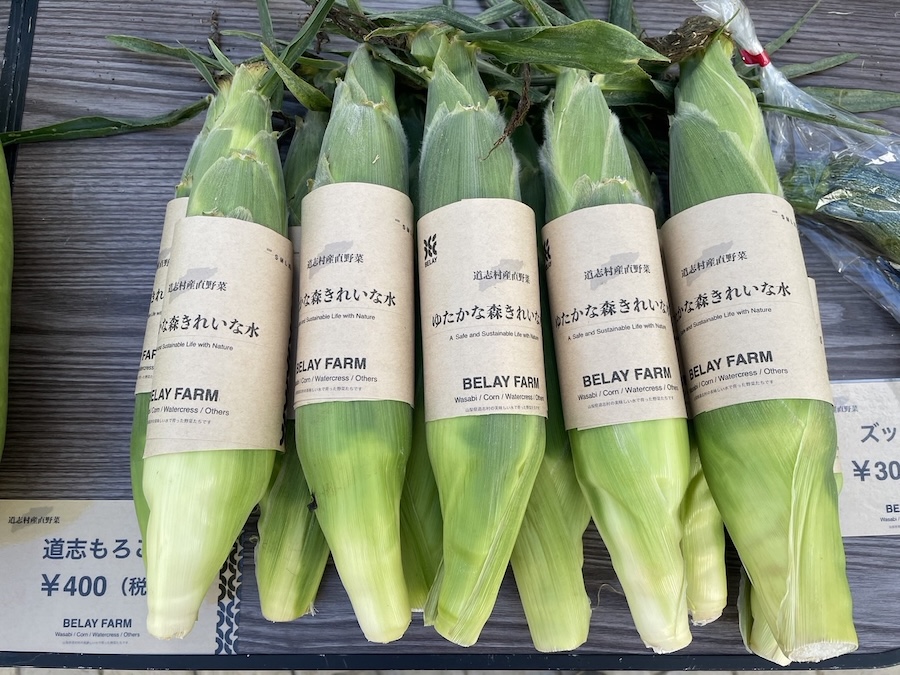 朝の始まりはBELAYの活動する山梨県道志村の産直野菜販売、美味しい水が美味しい野菜を作ります。特にモロコシは生でもびっくりする甘さで、皆さん驚きと共に売れ筋NO1でした!
