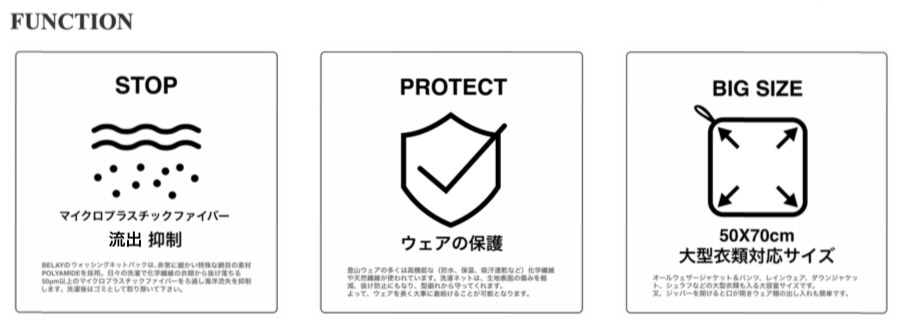 【STOP】日々の洗濯で化学繊維(ナイロンやポリエステルなど)の衣類からマイクロプラスチックファイバーが抜け落ちます。BELAYのWASHING NET BAGはマイクロプラスチックファイバーの海洋流出を抑制し、洗濯後はゴミとして処分してください。