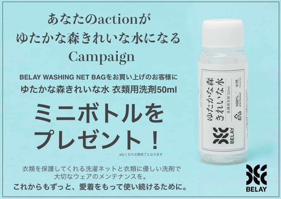 BELAY WASHING NET BAGをお買い上げのお客様に「ゆたかな森きれいな水 衣類用洗剤50ml」をプレゼント!