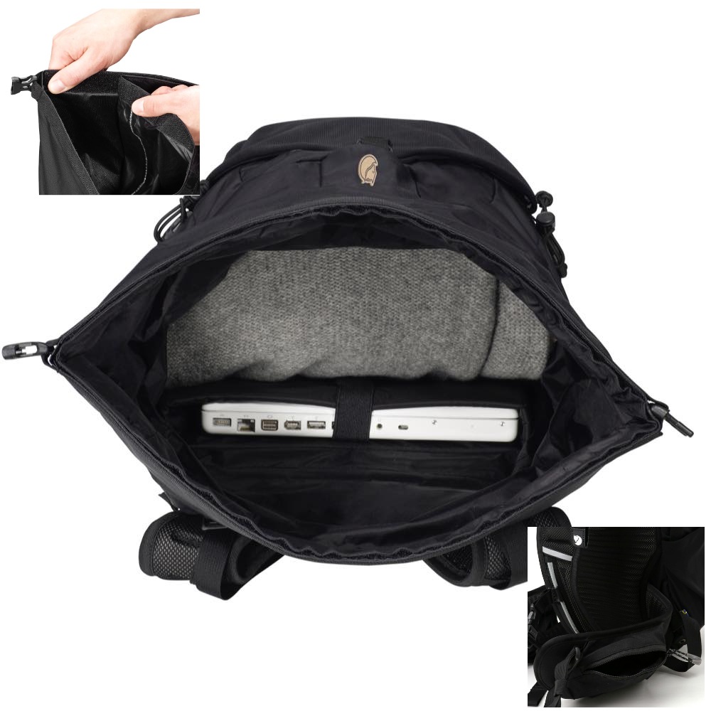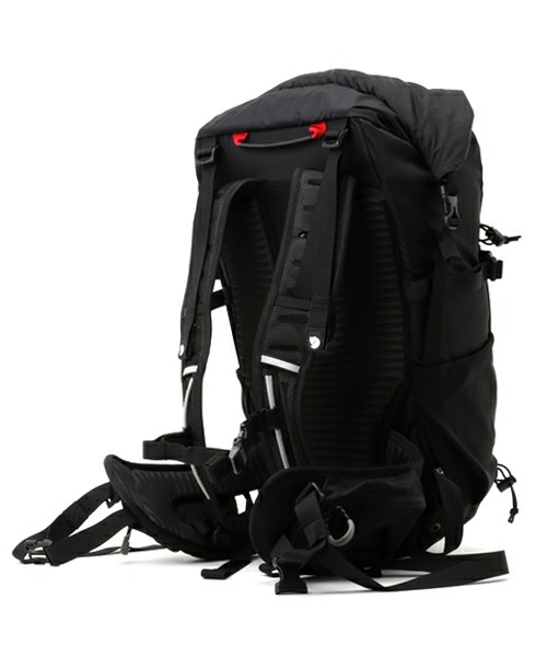 ロールトップタイプで雨等の侵入にも強い仕様であり、両サイドをフックでしっかりホールドする為見た目にもシンプルで美しい。ハーネスはソフトでハイキングやデイリーユースに使い易い仕様。