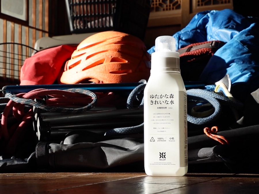 「ゆたかな森きれいな水」衣類用洗剤で自身のGORE-TEXシェルの洗い方を実演しながら解説。天野氏のウェア(道具)に対する愛着が伝わります。