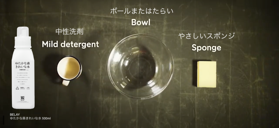 中性洗剤、ボールまたはたらい、やわらかいスポンジ、ぬるま湯で準備完了。