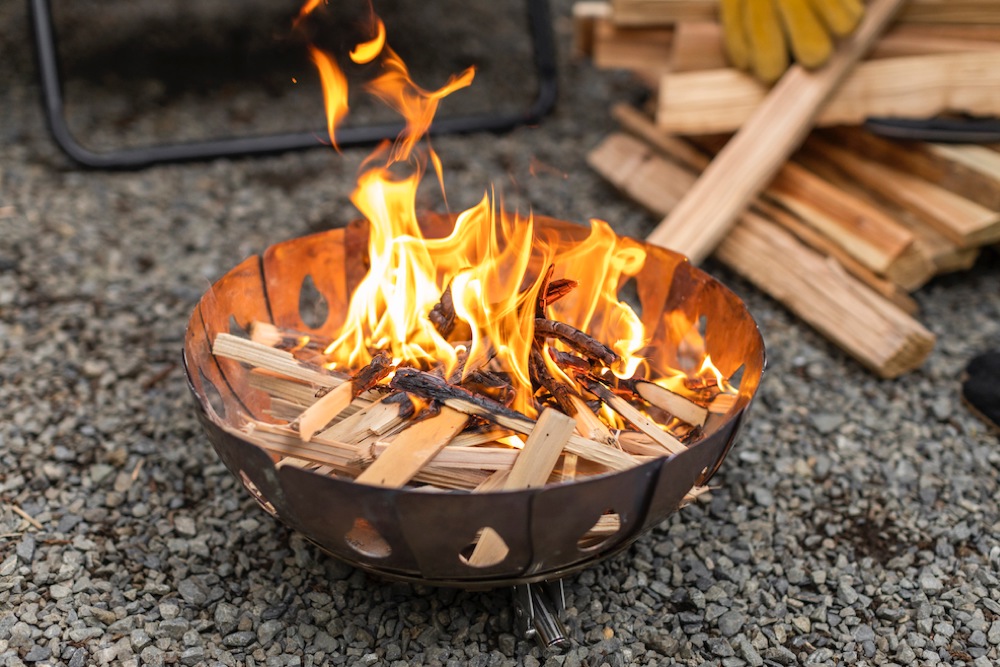 自然と一体感。開放感抜群のテントと共に焚火を楽しむ。