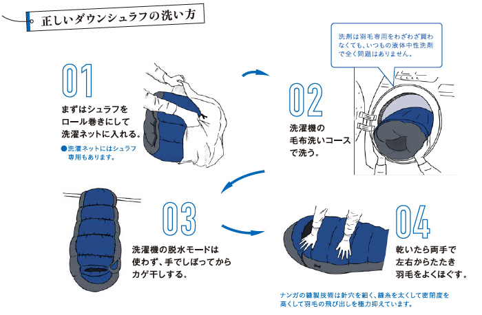 ナンガのダウンシュラフは修理費用を無料で、しかも、期間を限定せずに、永久に保証いたします。なぜこのような保証ができるのか? それは、ナンガが長年にわたるダウンシュラフの生産を通じて得た、独自のノウハウと、数々の実績による自信があるからなのです。ほとんどの登山者が今やダウンシュラフを使用しているにもかかわらず、汚れていてもなんとなく「保温性が下がりそう」、「高価なモノだから洗うなんてコワい」という方が多いのではないでしょうか。