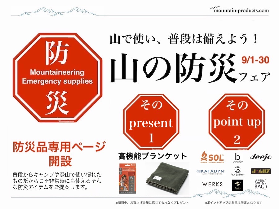 その1 期間中mountain-products.com内全商品対象で10,000円(税込)以上ご購入いただいた方にもれなく災害時に役立つ高機能ブランケットが貰えます!