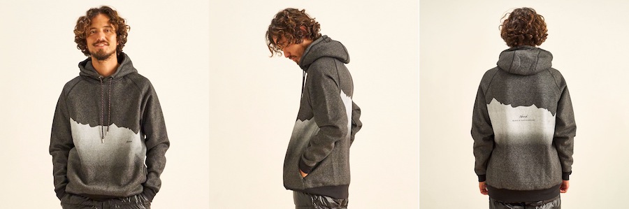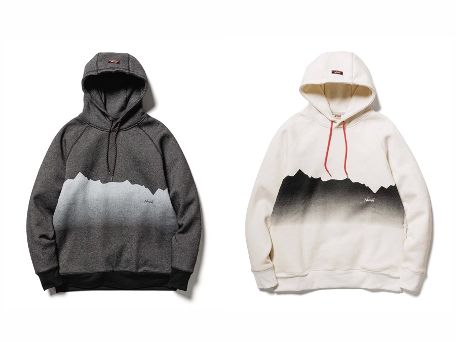 ナンガパルバットの稜線をグラデーションでプリントしたスウェットフーディー。モノトーンデザインで、日常着に取り入れやすくなっています。稜線のプリントがフロントからバックまで繋がります。