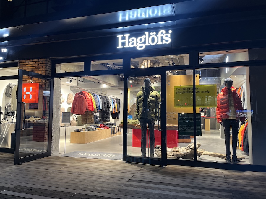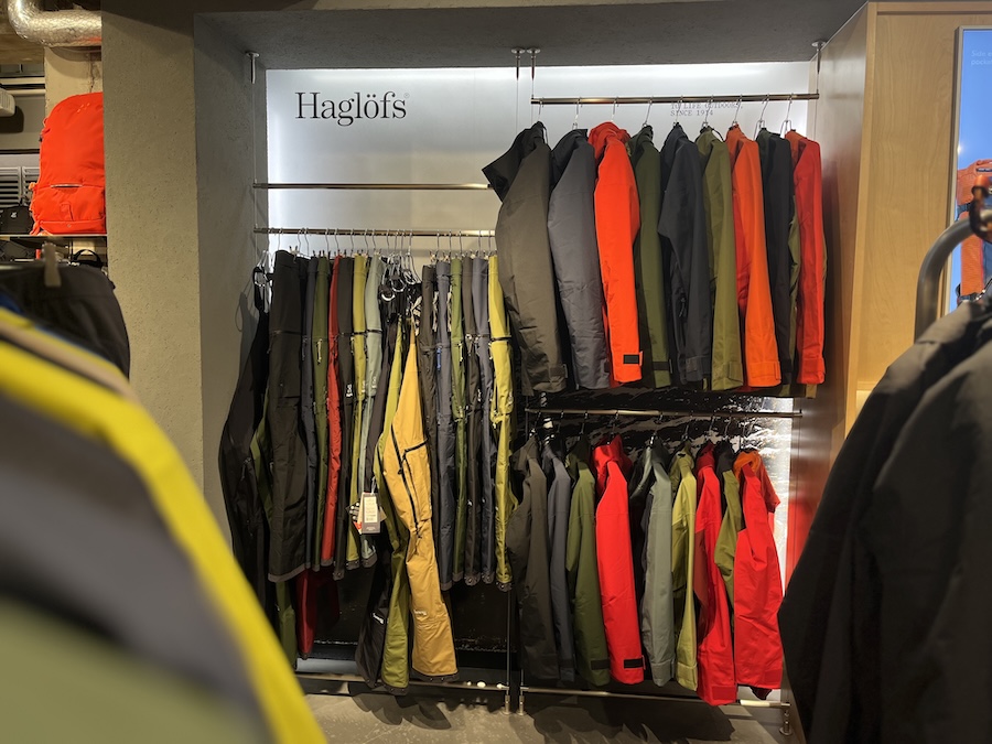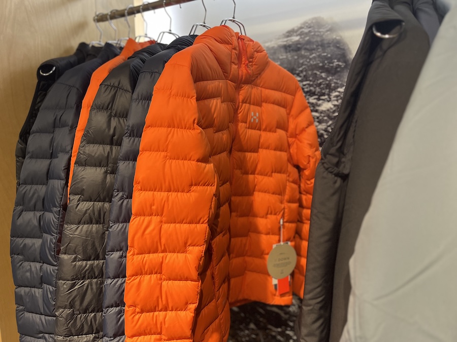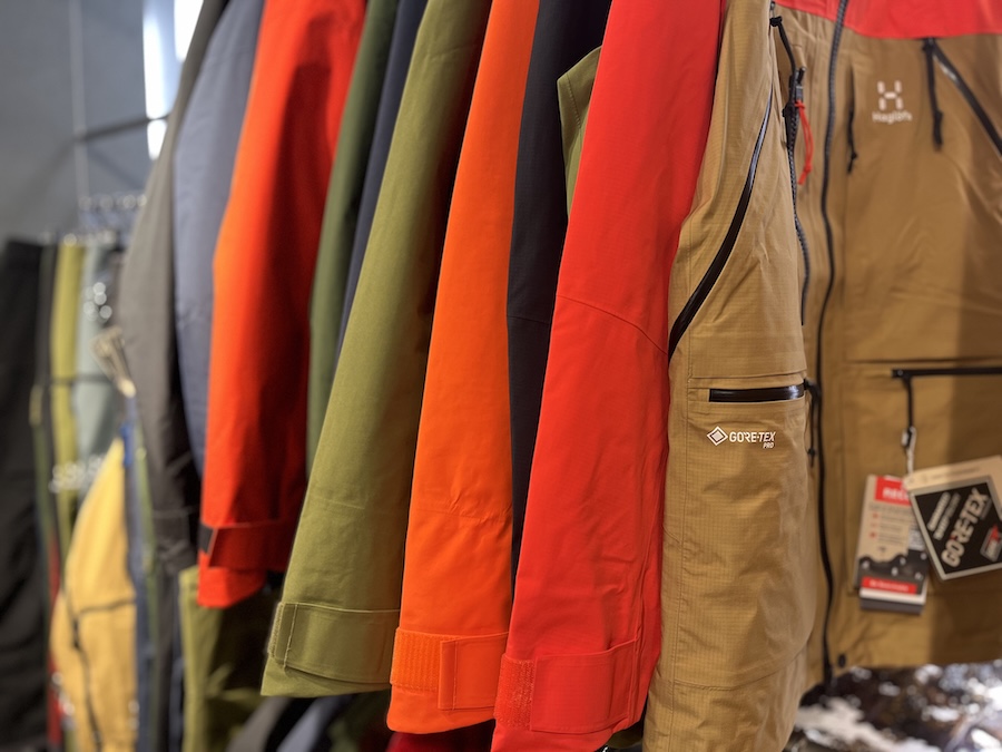 ズラリ並ぶゴアテックスのスノーウェア。北欧らしい色目や切り替えデザイン、保温性重視の中綿入アイテムやビブなどHaglöfs らしい細かいモノづくりのこだわりが詰まったエリアです。