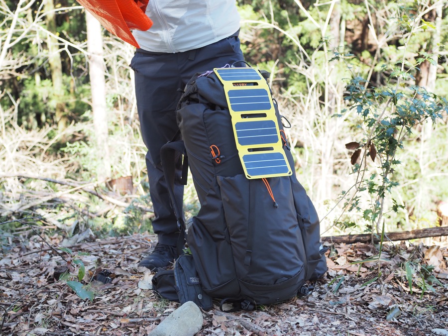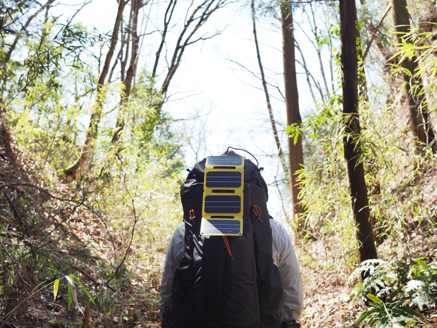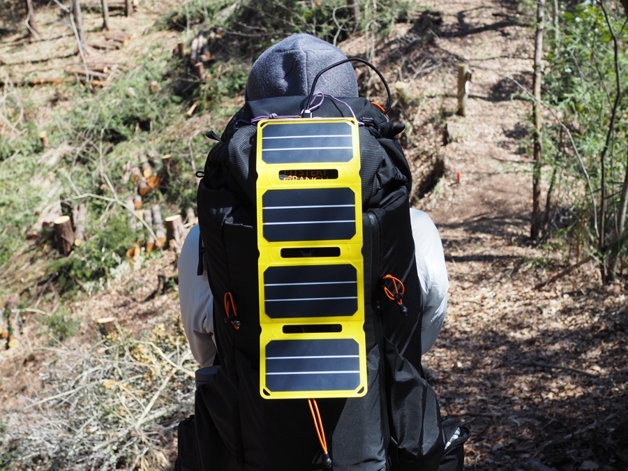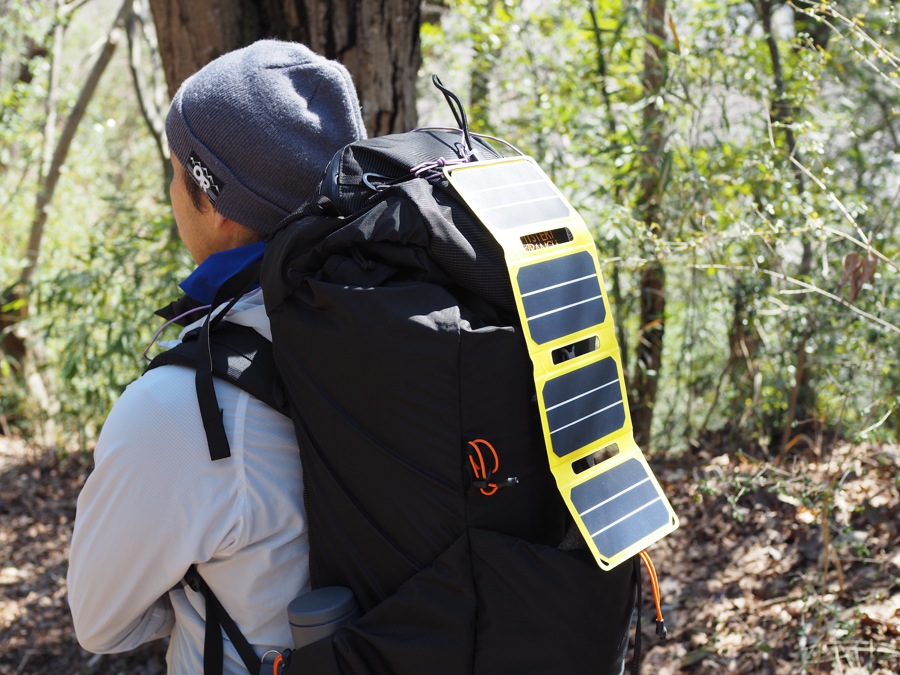 190gの超軽量ソーラーバッテリーをバックバックに装着してスタートです。