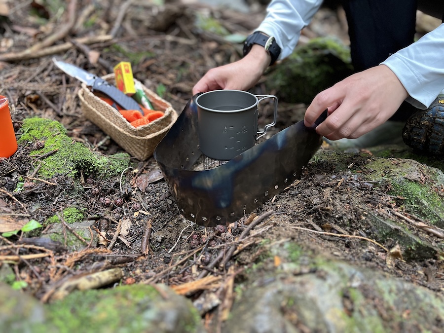 TOAKSチタンウィンドスクリーンで覆いあとは湯が湧くのを待ちます。ウィンドスクリーンを固定したい場合はペグを打つなどして。