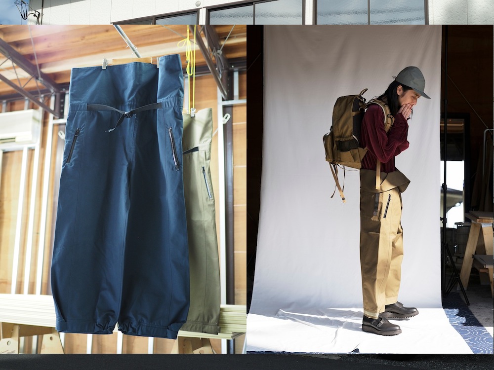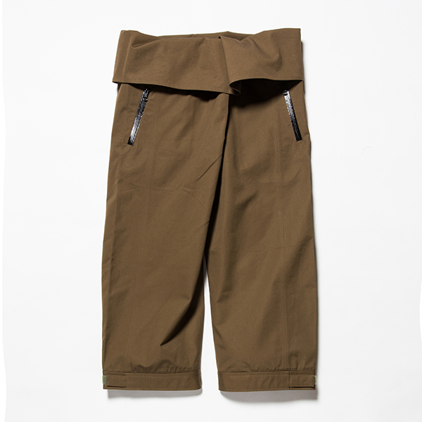 製作。タイパンツのディティールを使用し、レインパンツとしてパンツの上からの着脱を容易にした。