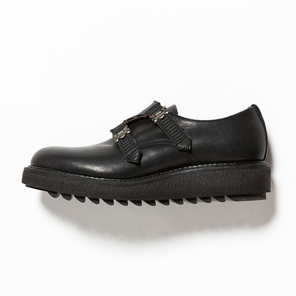 ブランドを代表するダブルモンクストラップにクレープソールを合わせたデザインをベースに、シャークソールを内側に配置した。