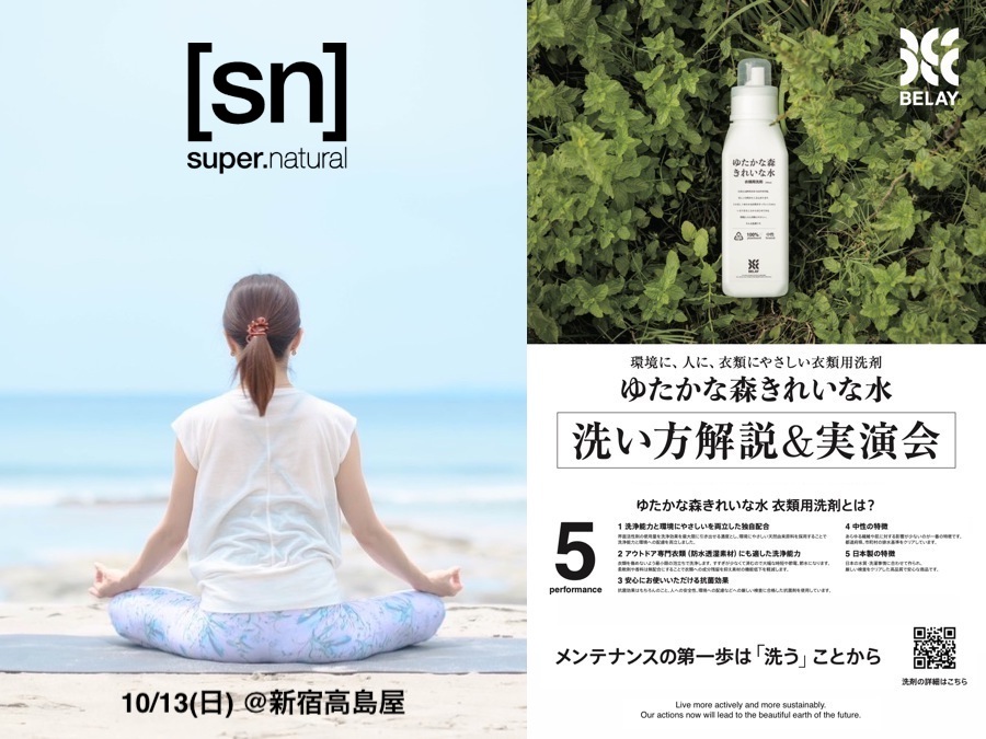 新宿高島屋にて9月25日(火) より開催中の「秋のスポーツ・ゴルフ フェスティバル」。[sn]super.naturalでは、[sn]ブランドアンバサダーの井上敦子さんによるヨガレッスン&衣類用洗剤「ゆたかな森きれいな水」実演販売を、10月13日(日)に開催いたします!