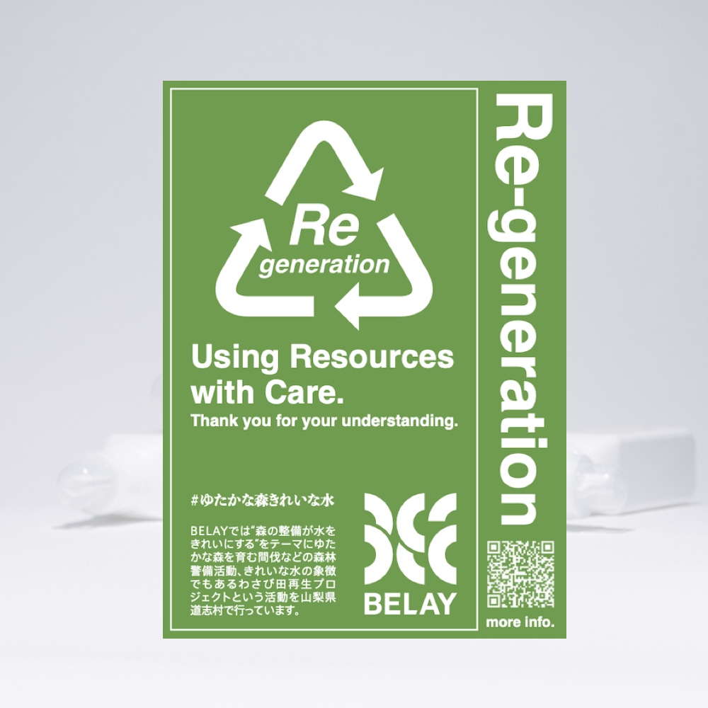 BELAYでは「使用済み容器は、廃棄物ではなく貴重な資源である」という考え方に基づき、「廃棄ゼロ」を目指し回収した使用済みボトルに新しい洗剤(従来品)を充填しRe-generation(再生)ボトルとして販売いたします。