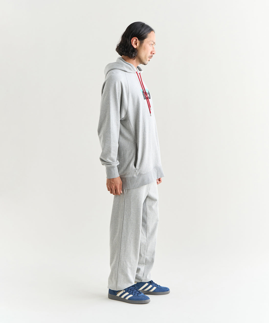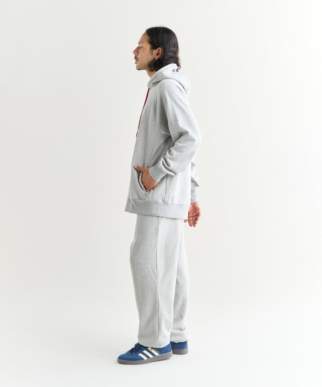 フロントにタックを入れることでウエストから腰回りにかけてゆとり持たせています。裾にかけては若干のテーパードが掛かっています。スウェットパンツでありながらも綺麗なシルエットになっています。街着としてはもちろん、自宅でのリラックスウェアとしても重宝します。