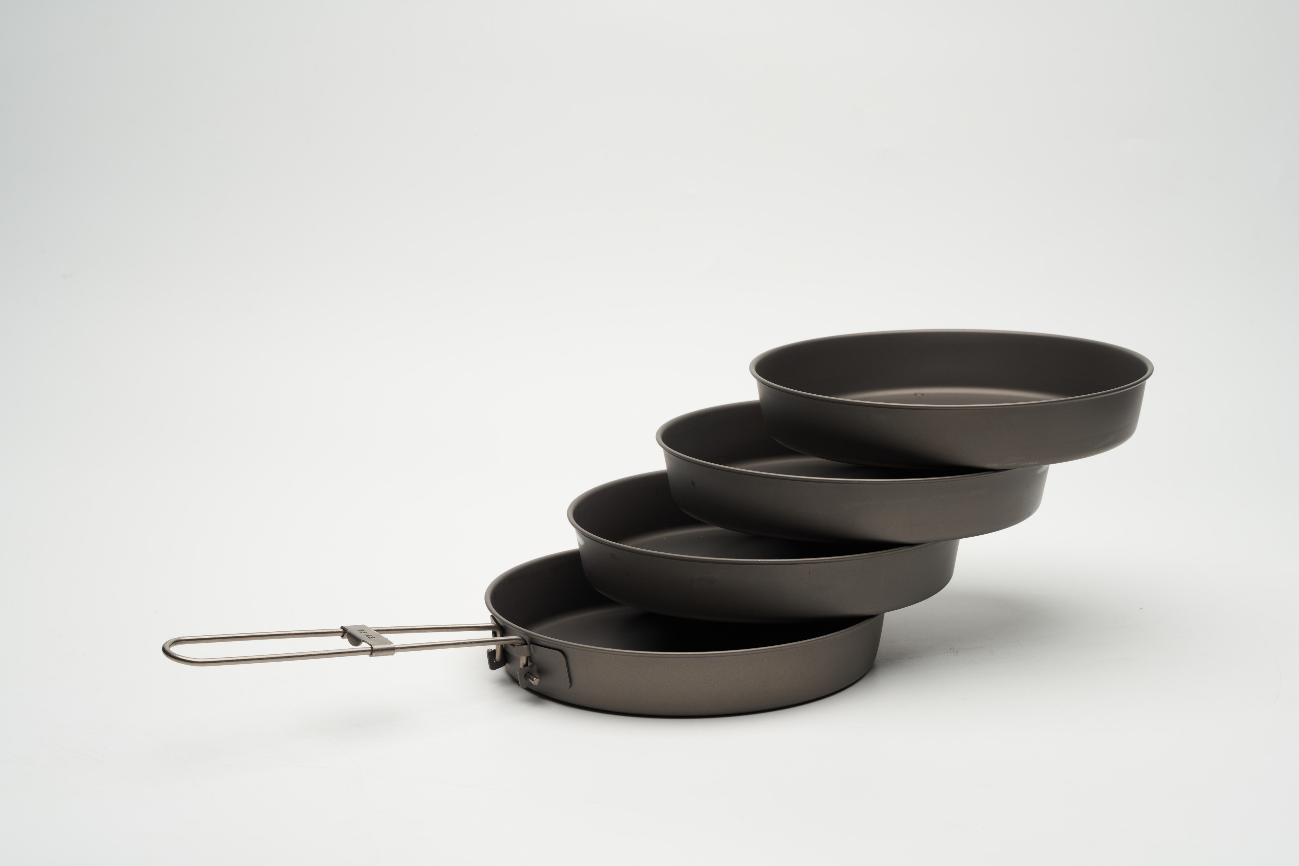TOAKS チタン製D-165mmディープパンセット 4点セットは、幅165mmのフライパンと、深型プレート3枚を組み合わせた、シンプルかつ省スペース設計のクックセットです。アウトドアでの本格的な調理や、焚き火を囲んだ食事を想定して作られています。